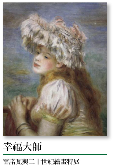 「幸福大師-雷諾瓦與二十世紀繪畫特展」是台灣有史以來第一次以雷諾瓦為主題的大型特展,透過六大主題的規劃-戴帽女子、花卉、女人、田園與音樂、身體表現、法國南部與地中海,忠實呈現雷諾瓦尊重傳統、勇於革新的藝術創作精神,並帶給畢卡索、馬諦斯等眾多後世藝術家的深遠影響。